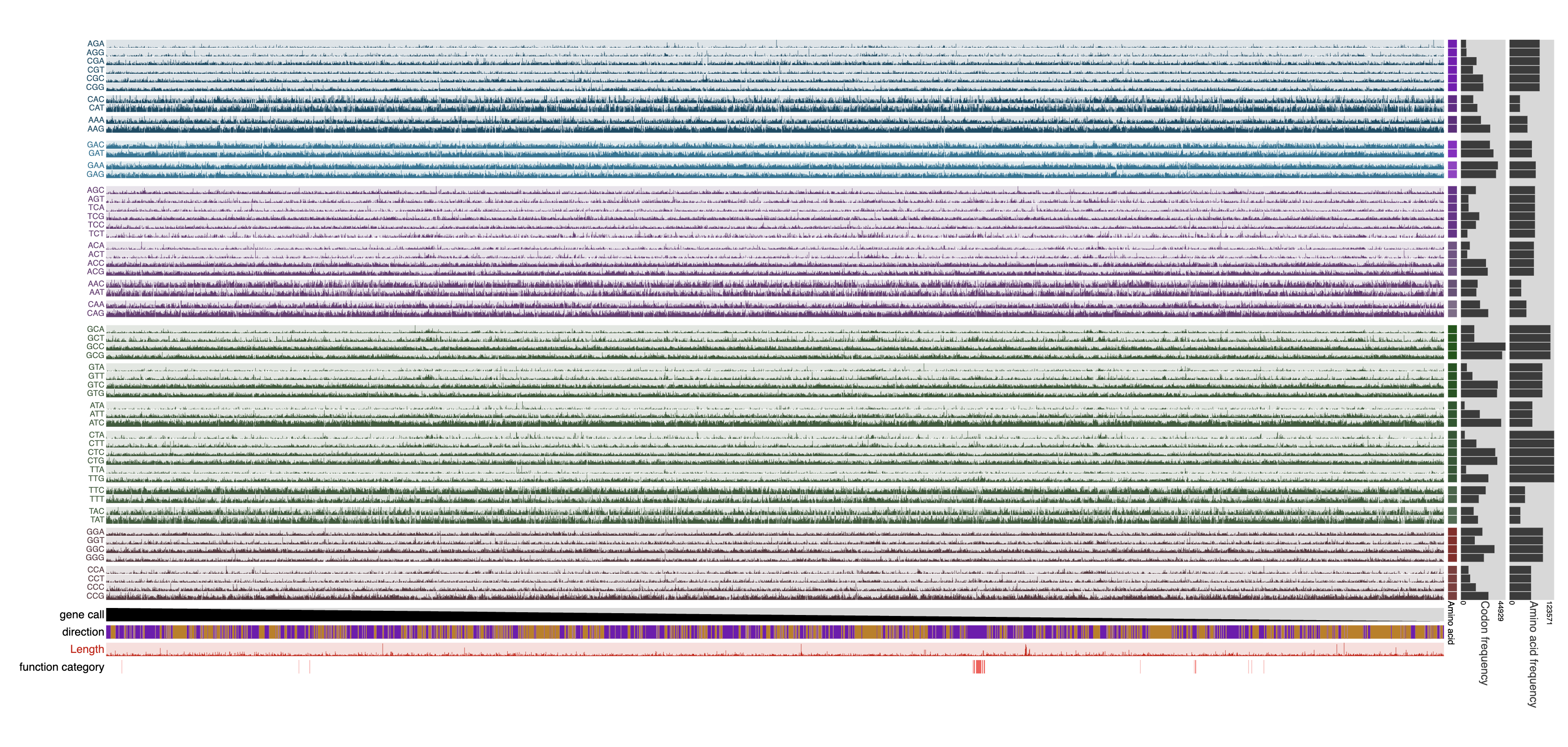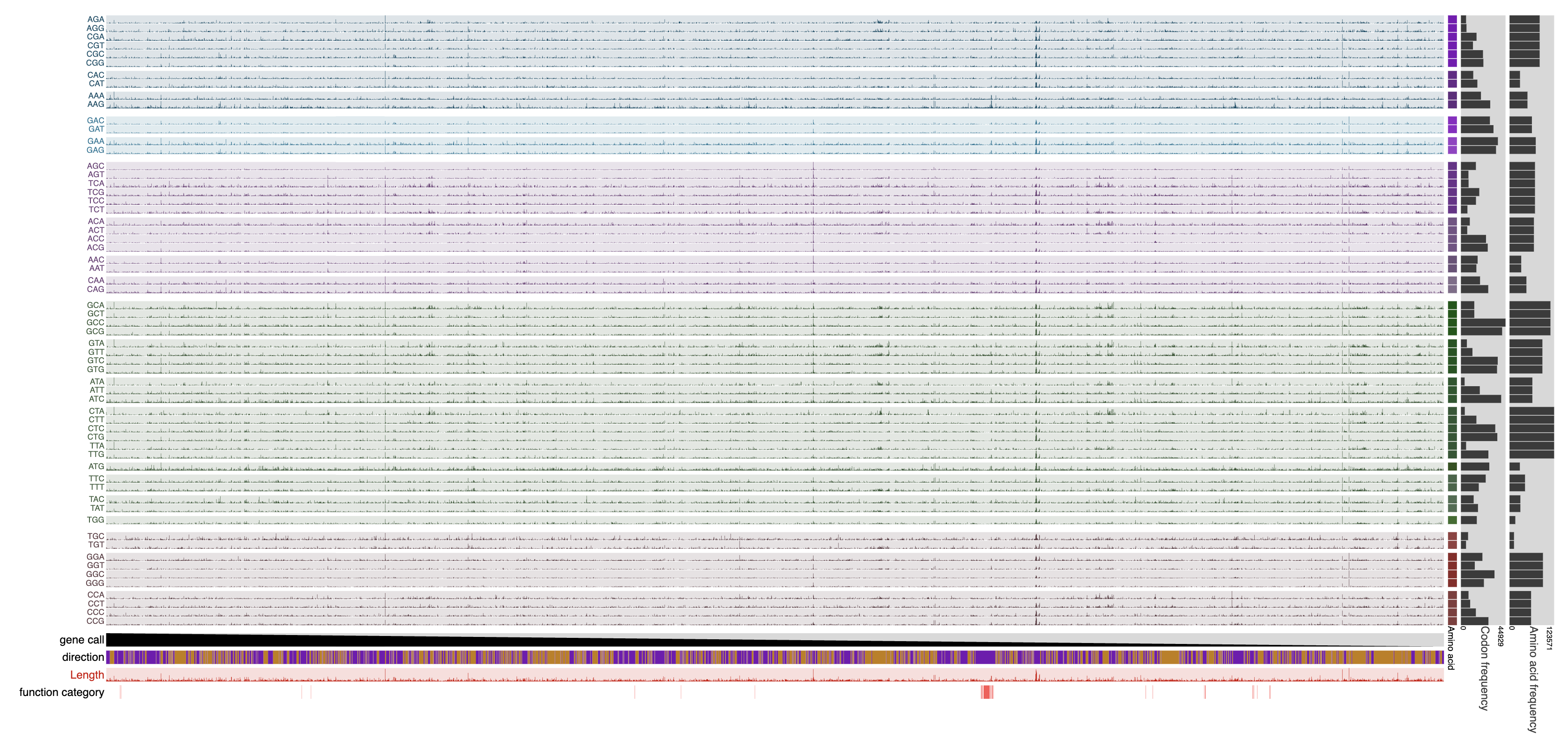 The program calculates gene-level frequencies of individual codons and displays them in a matrix format where each row represents a codon (ordered by the amino acids they encode), each column represents a single gene, and the data points represent the counts (or frequency, depending on user-provided parameters) of occurrence of a given codon in a given gene. By default, the program orders each gene based on their synteny (the conserved order of genes across genomes) to reveal patterns in codon usage throughout the genome.