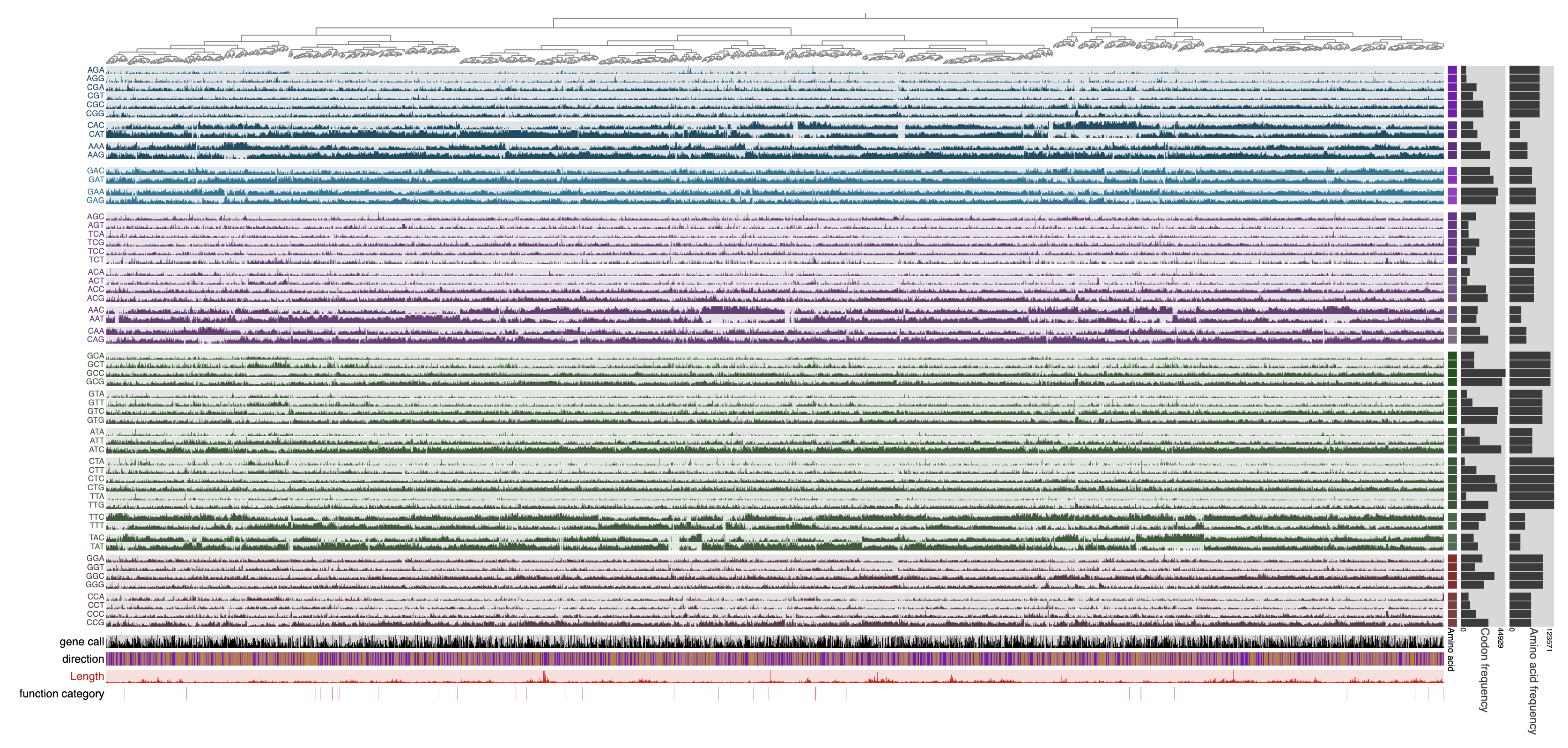Once the display is shown, the genes can also be ordered based on hierarchical clustering of the codon frequencies using the Settings panel, and then selecting the ‘Codon frequencies’ option from the ‘Order’ menu and clicking Draw to bring together those genes that show similar codon usage patterns regardless of their location in the genome: