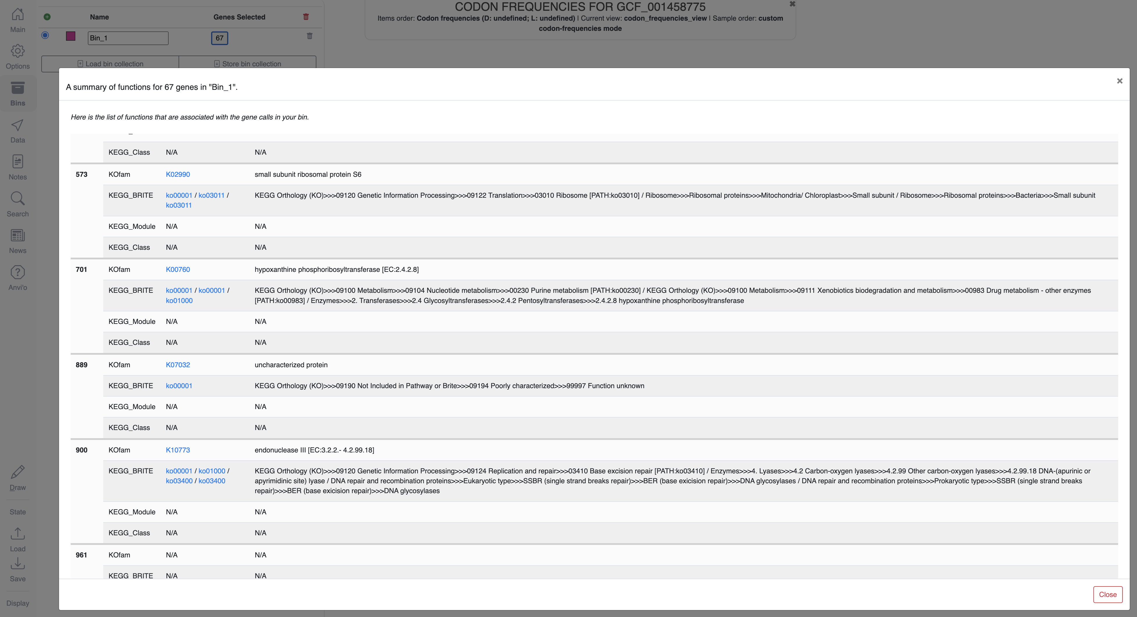 Bin selection is possible in all visualizations, and clicking on the button that shows the number of genes in a given bin in the Bins panel will open a window that displays their functions: