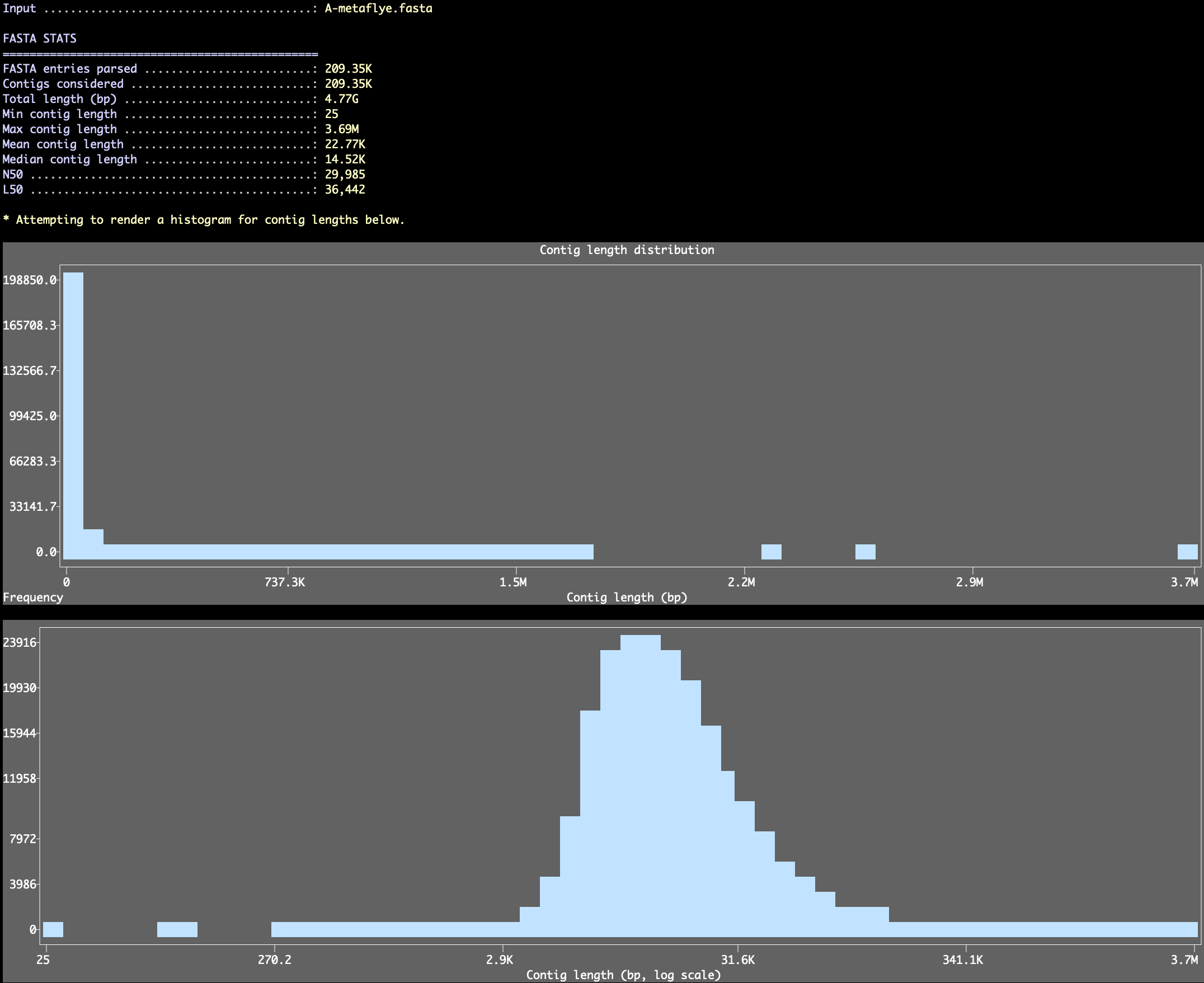Which will report entry counts, length totals, min/max/mean/median lengths, and N50/L50, and render length histograms in the terminal (anvi’o will pick a bin count for these histograms, but you can also set a specific number using the --length-histogram-bins parameter and control the plot height with --length-histogram-height).