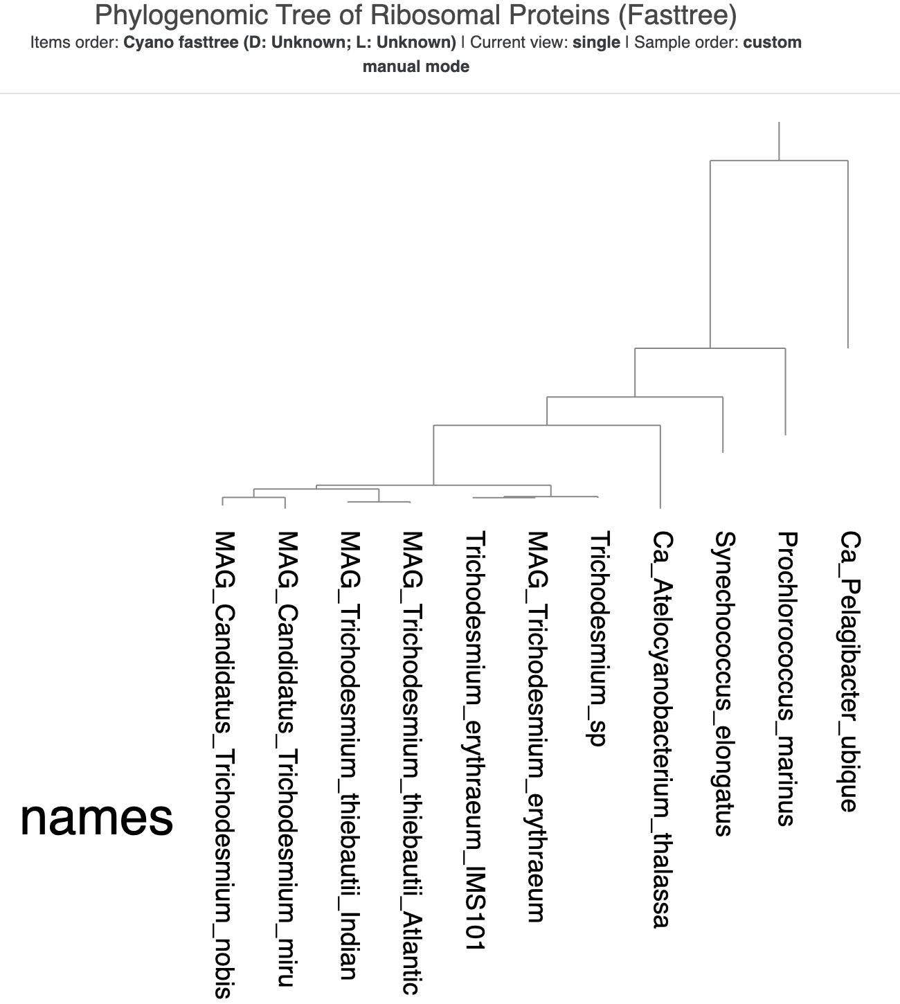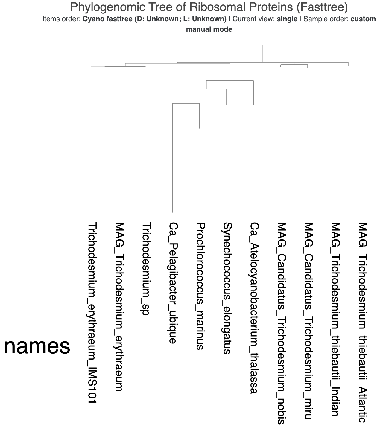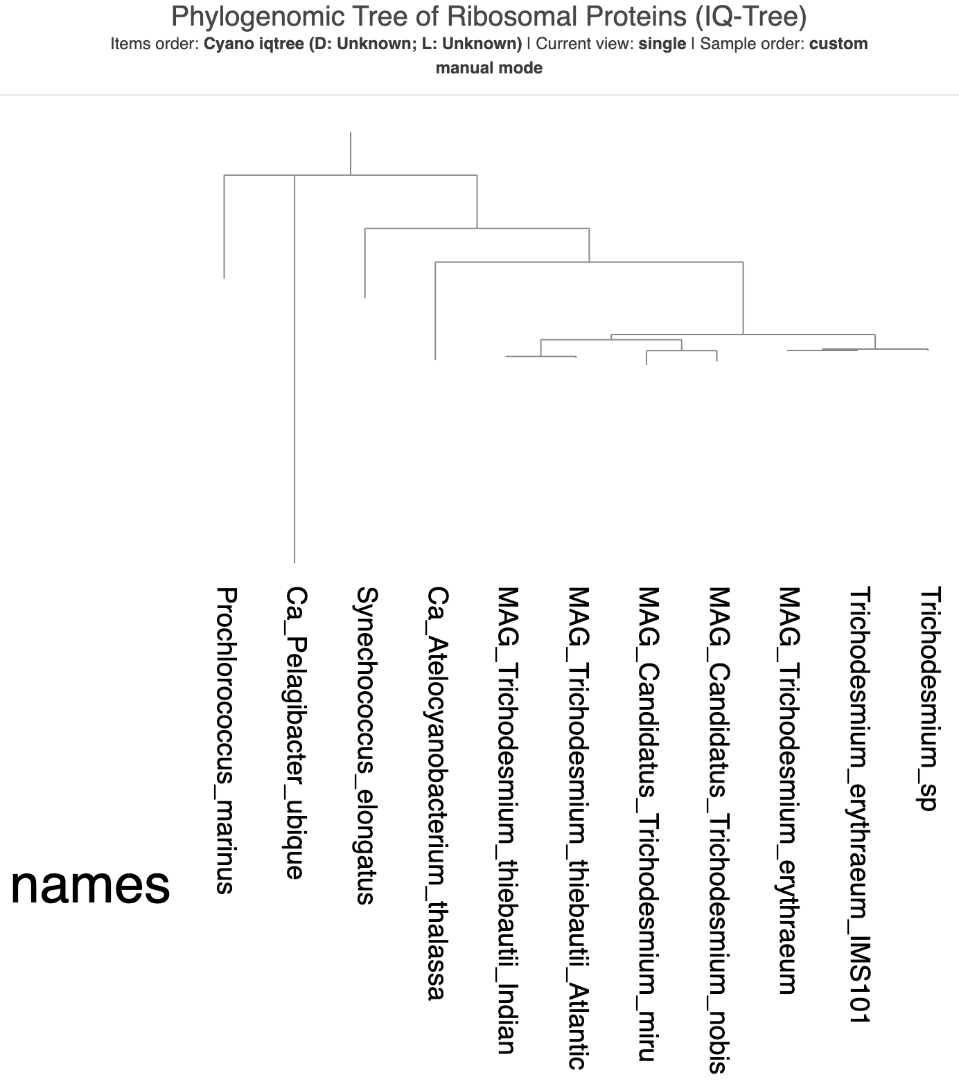 That very long distance between SAR11 and P. marinus is now a bit awkward. Luckily, we can do horizontal rotations of branches in the tree because these don’t affect the inferred evolutionary relationships in the tree. Right-click on the branch leading to the division between P. marinus and the rest of the genomes (besides SAR11), and select the option ‘Rotate the tree/dendrogram here’. That should flip the rest of the branches so that the tree now looks like a staircase, with the Trichodesmium genomes all the way on the left: