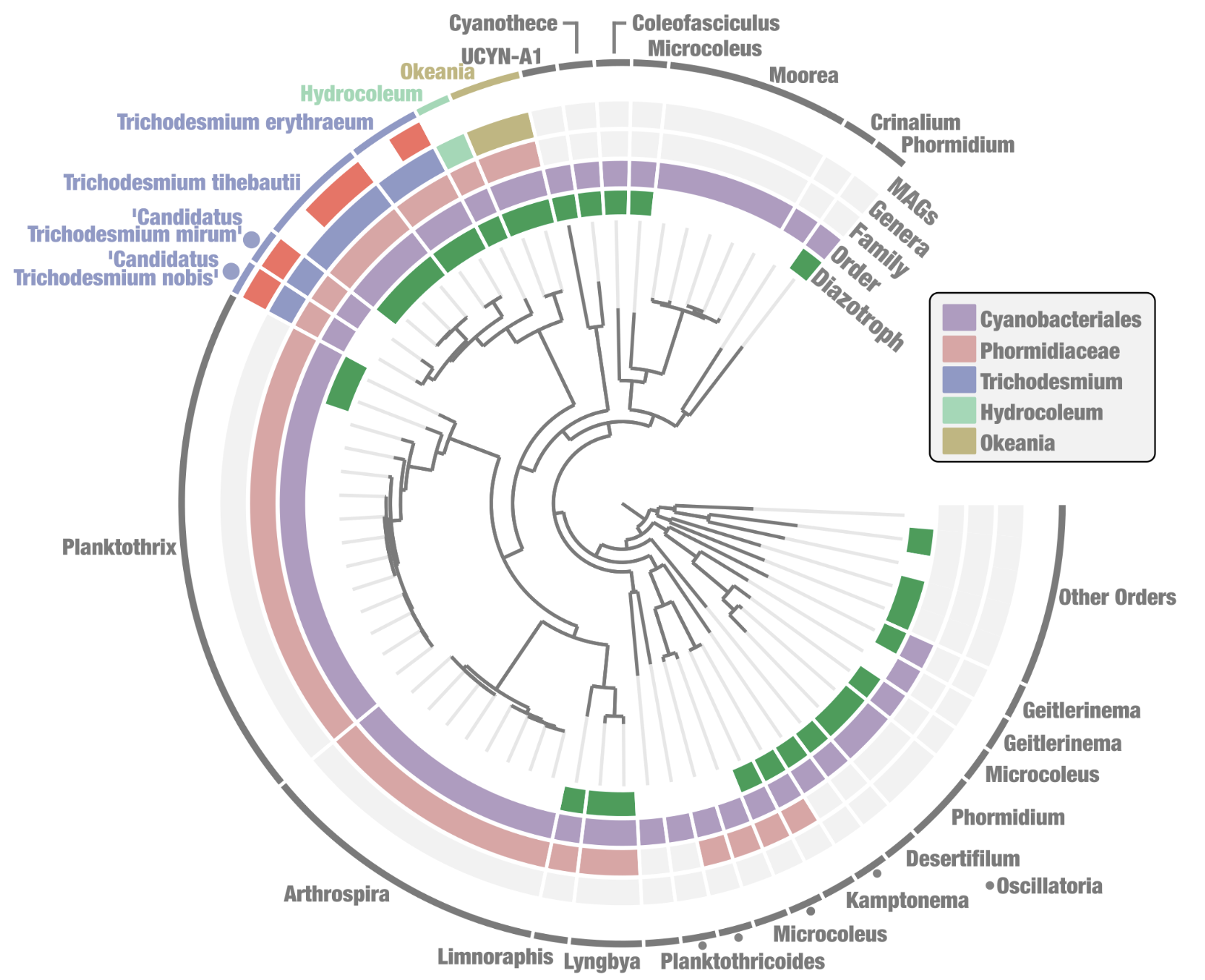 | MAG_Candidatus_Trichodesmium_nobis | 20 | 13 | Bacteria | Cyanobacteriota | Cyanobacteriia | Cyanobacteriales | Microcoleaceae | Trichodesmium | Trichodesmium sp023356535 |