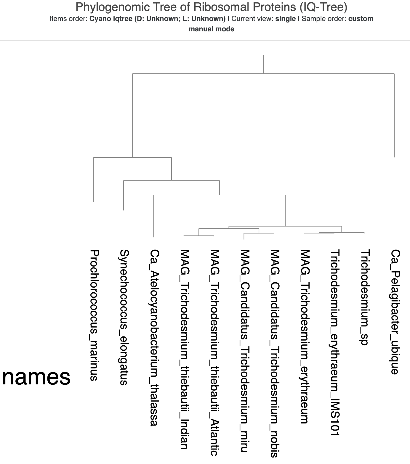Our three non-Cyanobacteriales genomes failed the composition test, meaning that their ribosomal protein sequences were significantly different from those of the Cyanobacteriales. That makes biological sense, and also helps explain why the root now contains two genomes. Based on our earlier tree from FastTree, we know that P. marinus was the most closely-related to our SAR11 genome. Their RPs must have been so similar, and so different from the Cyanobacteriales genomes, that IQ-Tree put them together in the root.