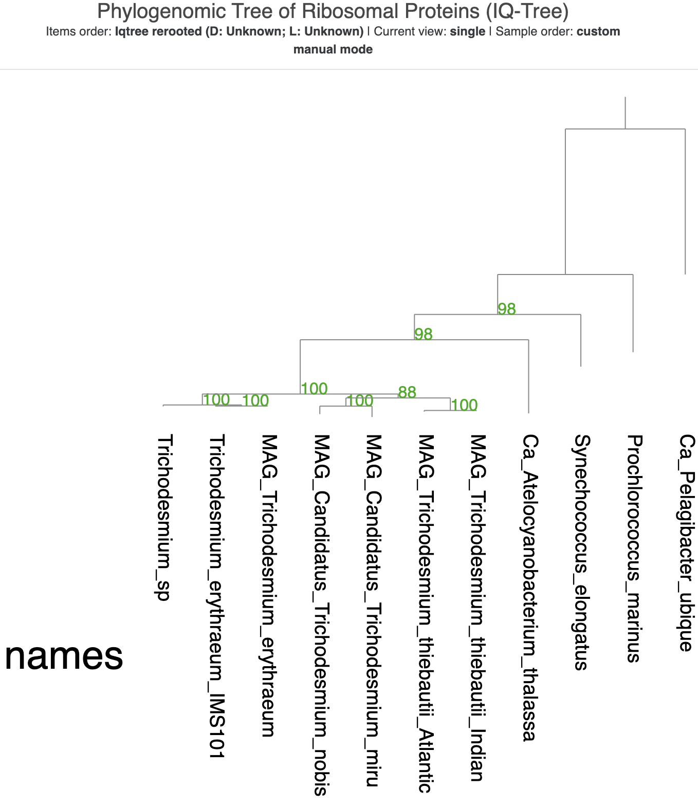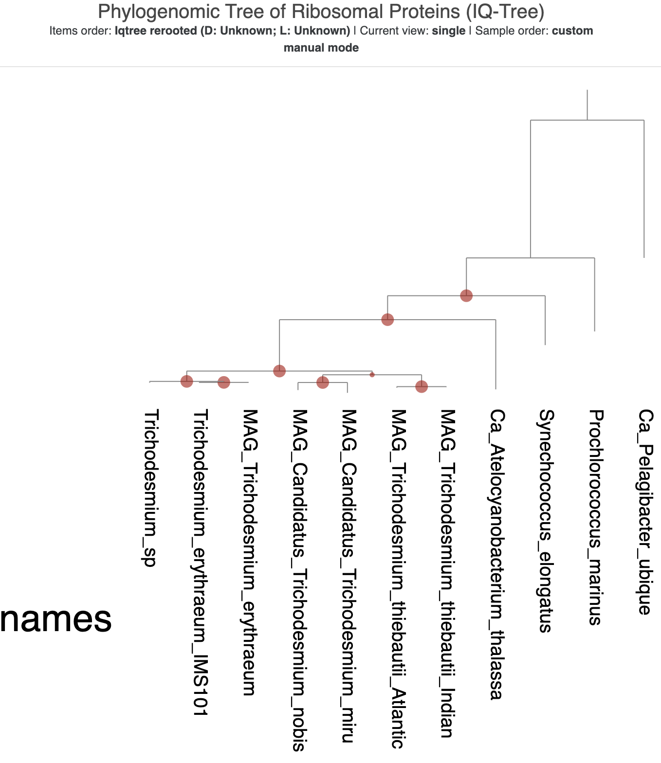 You can see that most of the branches have good support values. The outermost two branches are the only ones without support values. A root of a phylogenomic tree typically gets a null support value, and since IQ-Tree placed both SAR11 and P. marinus at the root, both of their branches lack any support value (even after we explictly made SAR11 the root).