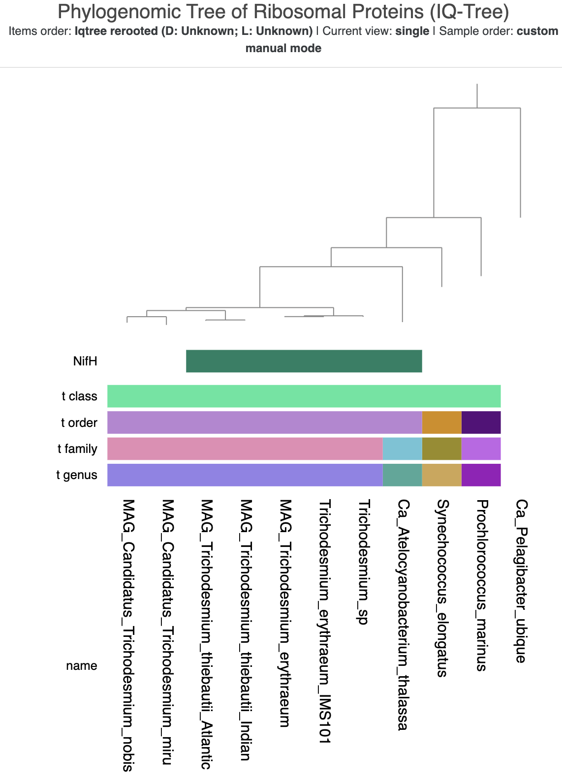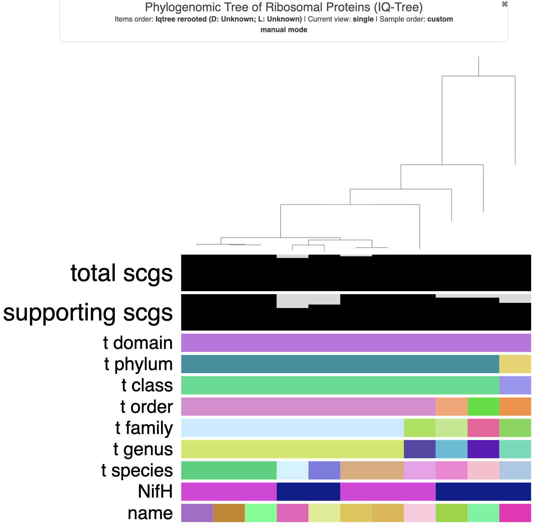 total_scgs, supporting_scgs, t_domain, t_phylum, and t_speciesNifH layer to the very top so that it is the closest to the tree tips.t_class and for NifH to 50 and 100, respectively. This will add some extra white space in between the tree and the NifH data, as well as in between the NifH data and the taxonomy information.name layer from ‘Color’ to ‘Text’ and make the background color of the text white.NifH layer so that a value of ‘False’ is displayed in white. Feel free to change the color for ‘True’ values as well, if you want. I made them green to mimic Tom’s supplementary figure.NifH layer that looks a bit strange. You could rotate those branches in the tree to put T. nobis and T. miru on the outside, if you’d like.Here is what the tree looked like when I was done with it: