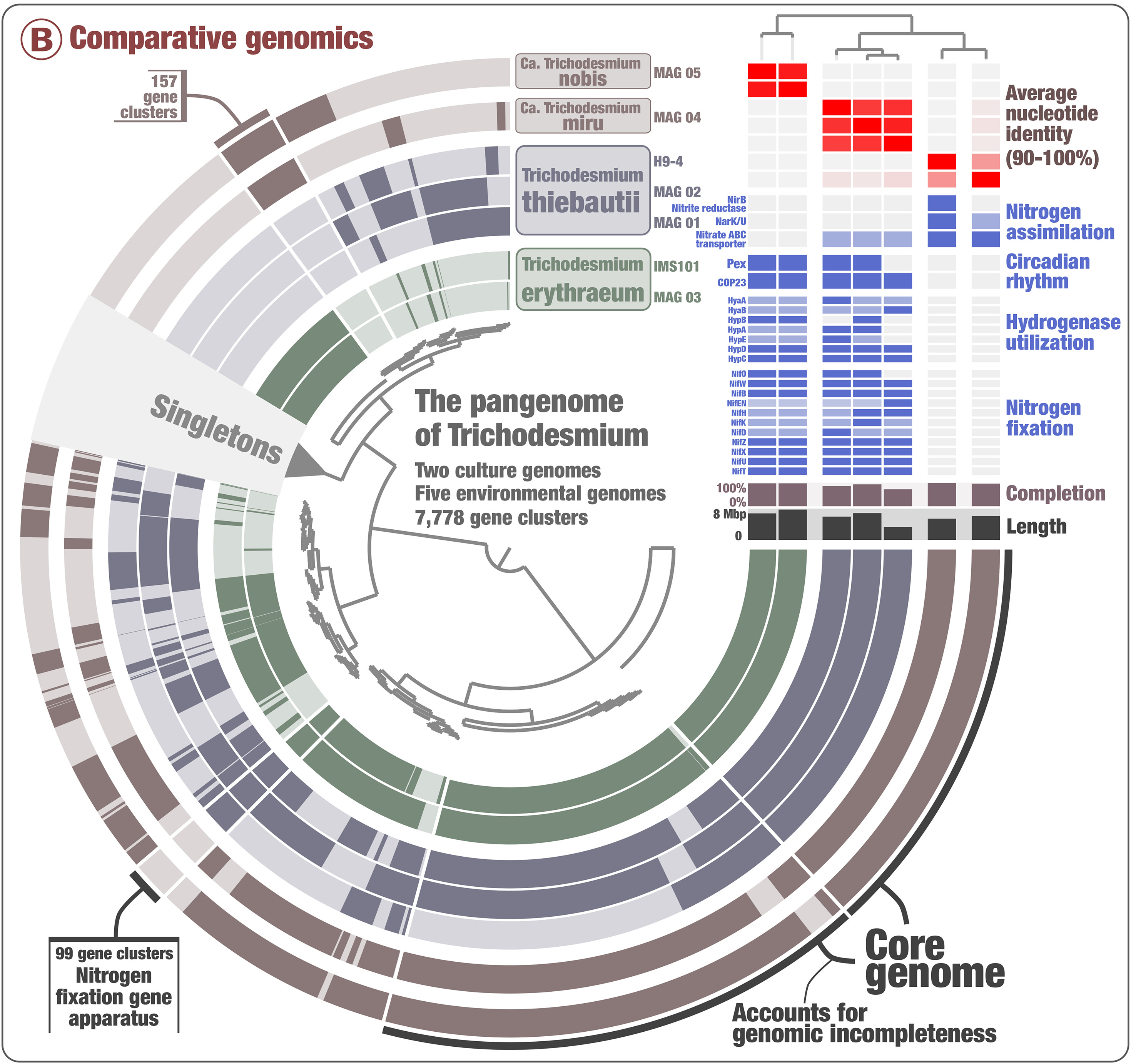 As a little preview, the essence of the story is this: Trichodesmium species are well-known cyanobacterial nitrogen fixers (‘diazotrophs’) in the global oceans, but – surprise – it turns out that not all of them can do nitrogen fixation. Tom used a combination of pangenomics, phylogenomics, and clever read recruitment analyses on a set of MAGs and reference genomes to demonstrate that two new (candidate) Trichodesmium species, Candidatus T. miru and Candidatus T. nobis, are nondiazotrophic.