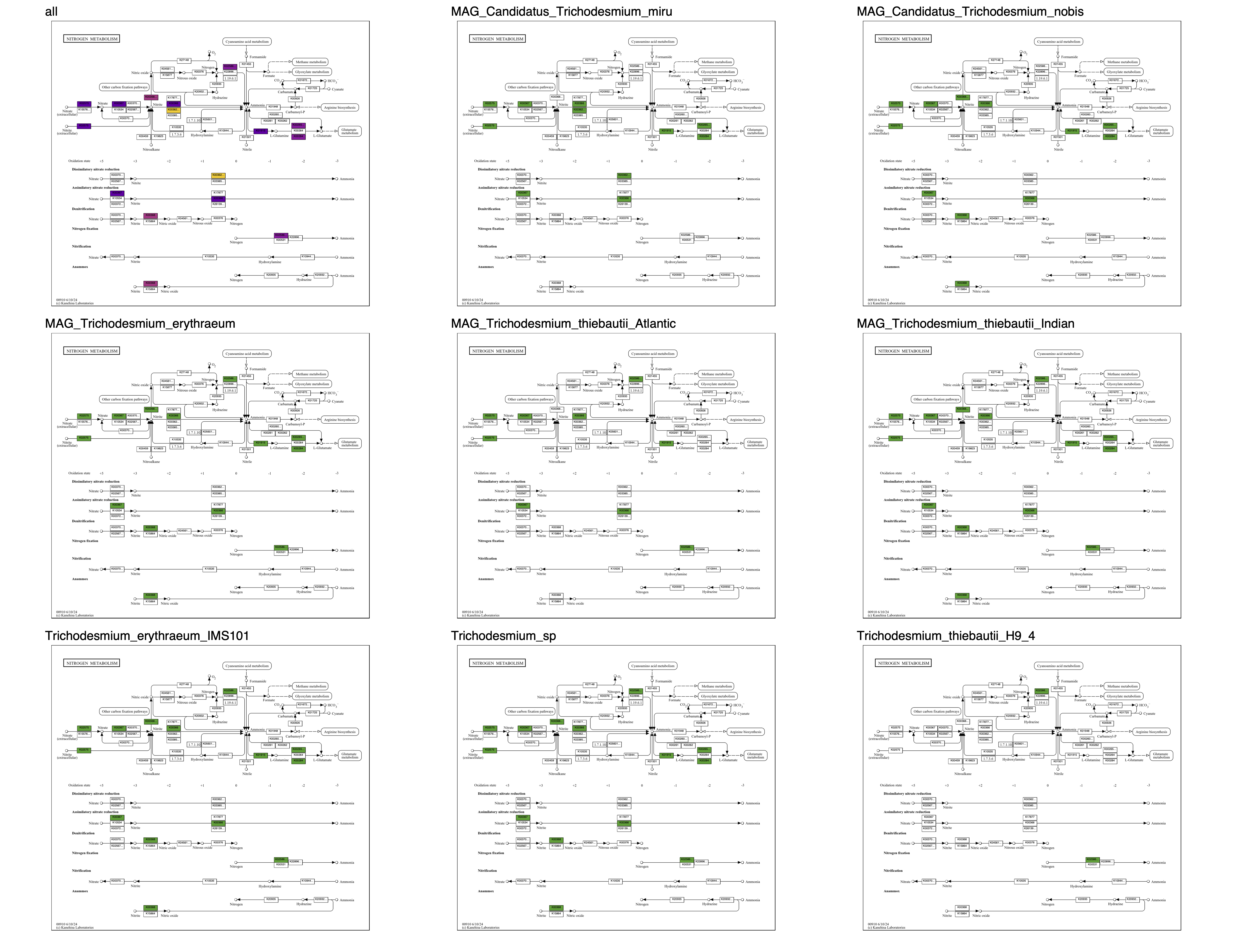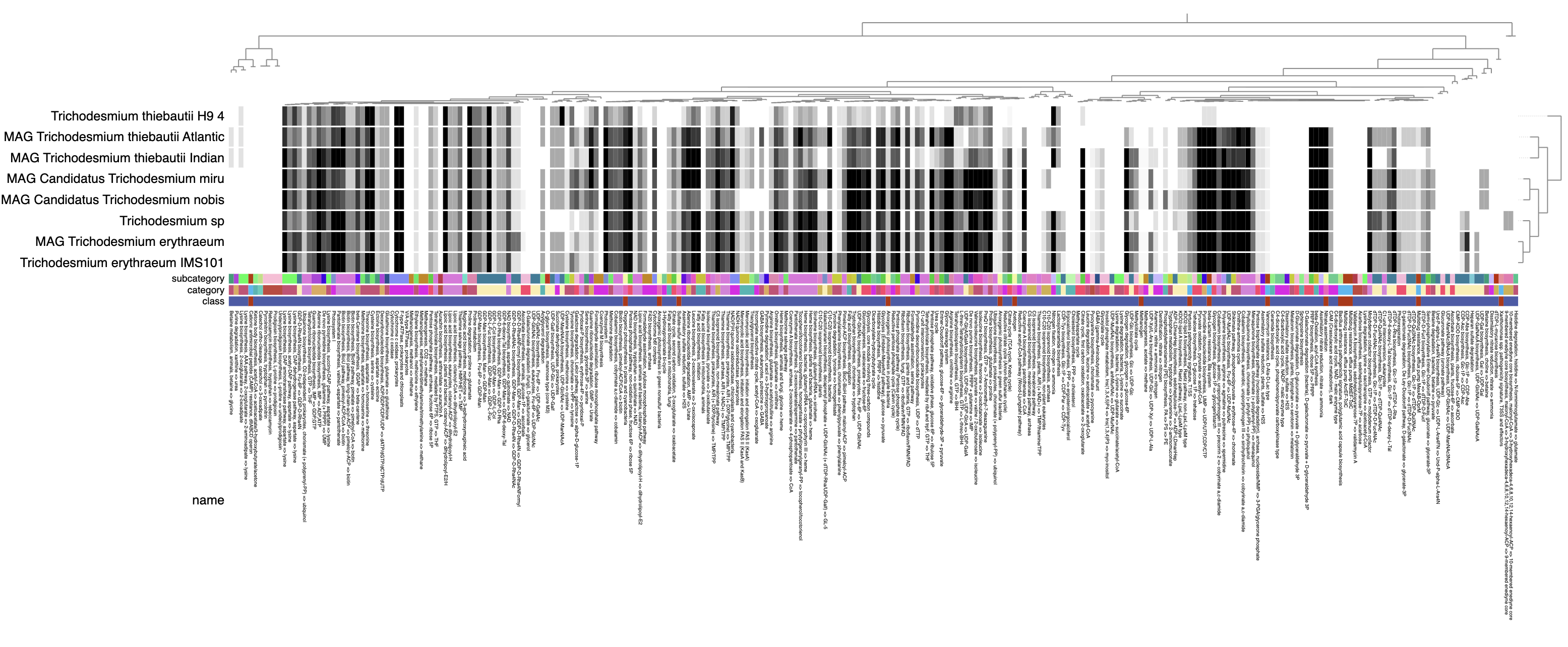 We’ve now used several different strategies to investigate the metabolism of our Trichodesmium genomes and their bacterial associates. We’ve once again recapitulated the lack of nitrogen fixation in T. miru and T. nobis, and we’ve tried some very new programs for predicting metabolic interactions