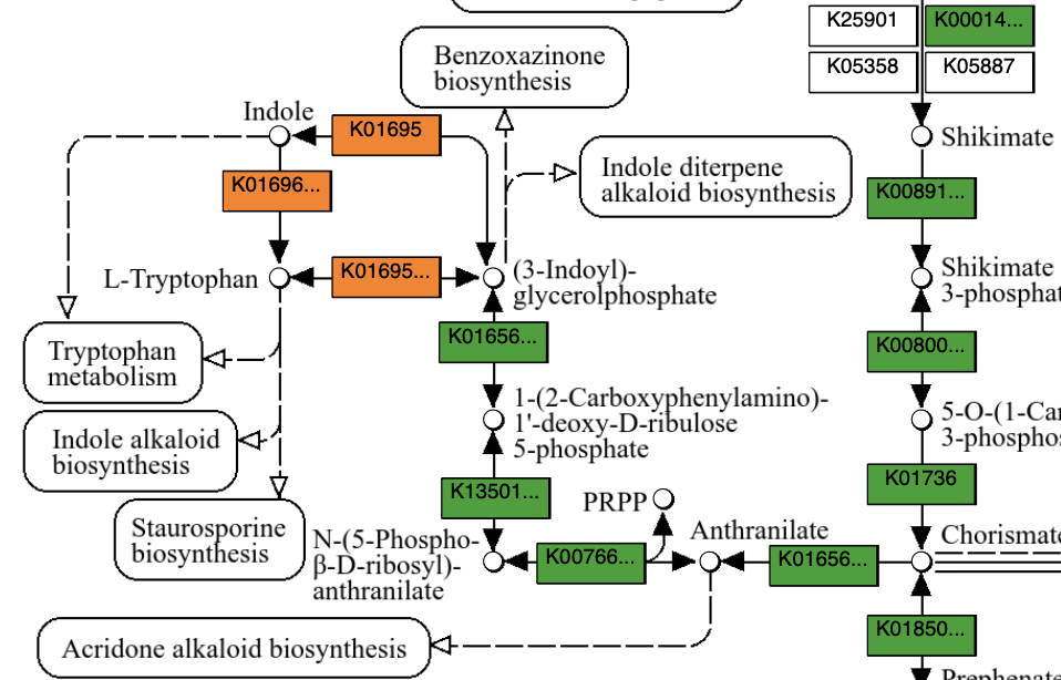 Okay, so far it looks pretty promising. There is a very long chain of reactions to produce tryptophan from phosphoenolpyruvate in A. macleodii, and nothing at all in T. thiebautii. But just to be sure, let’s also visualize map 00400 for these two genomes with anvi-draw-kegg-pathways (and while we are at it, let’s include the production maps for the other two interesting predictions):